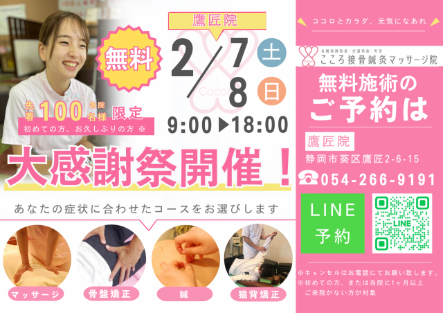 当院は葵区に4院展開する、ソフトな矯正で痛み・こりを改善に導く接骨鍼灸マッサージ院です。